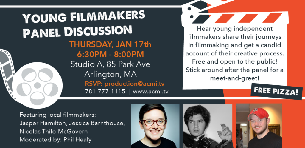 Hear young independent filmmakers share their journeys in filmmaking and get a candid account of their creative process. Panel includes: Jasper Hamilton, Jessica Barnthouse, Nicolas Thilo-McGovern, and Nuria Pellicer. Moderated by Phil Healy of Boston Open Screen. Free and open to the public, refreshments provided.